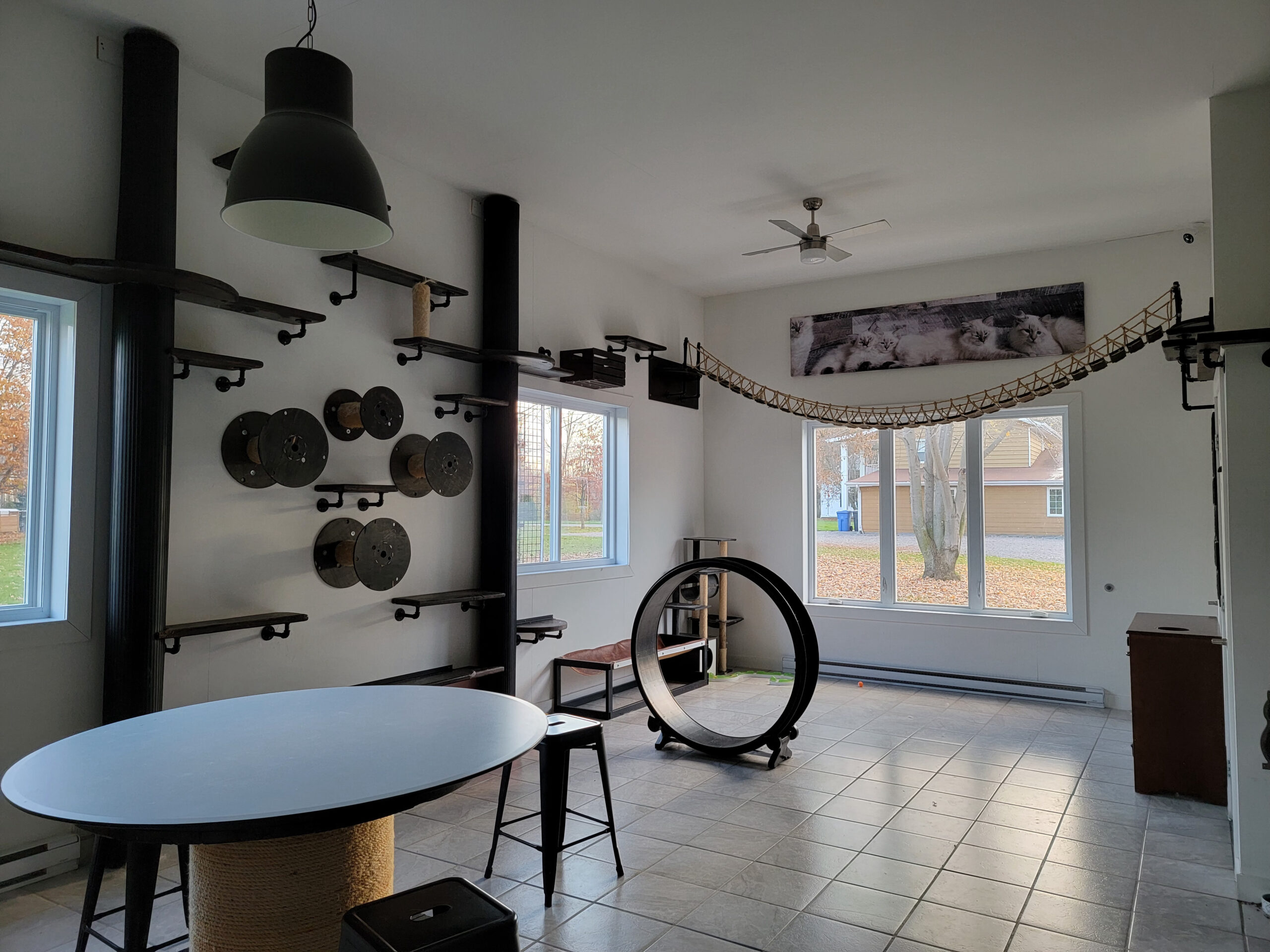 Un grand espace commun est utilisé en tout temps sauf lors des périodes d’allaitement pour les mamans et les bébés trop jeunes pour être avec les « grands ». Cette espace leur permet de sociabiliser et de se dégourdir les pattes!