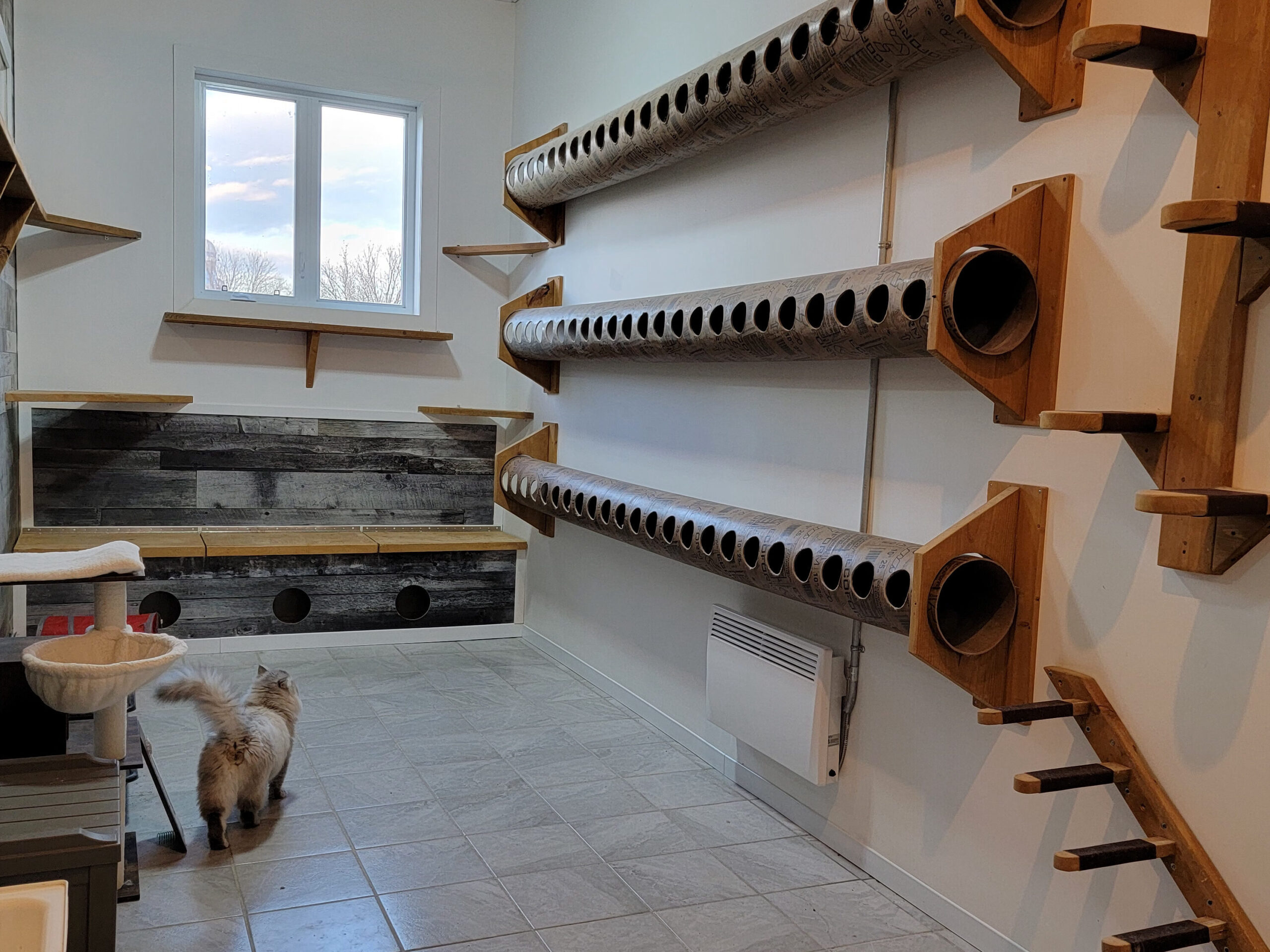 Avec nos 2 bâtiments de plus de 12 pieds de hauteur, nous avons l’espace pour aménager le meilleur milieu de vie possible pour nos reporducteurs et nos chattons en développement.