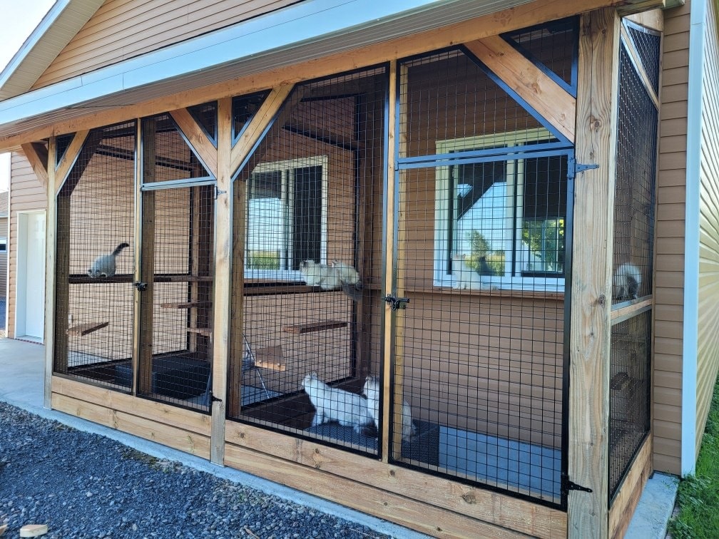 Nous avons également aménagé des espaces extérieurs sécuritaires qui sont accessible en tout temps pour éviter le confinement intérieur et permettre à nos chats de respirer de l’aire frais et d’emmagasiner de la vitamine D